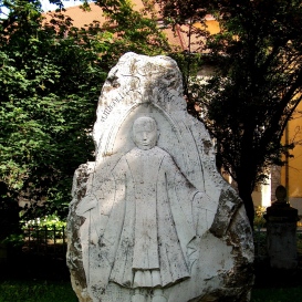 A fehér mészkő - melyből a művész az emlékkövet felírata szerint 'faragta' - 2 m magas. Felül jelmondat, balra lent név, jobbra 'gregorián' kotta látható az alak mellett.