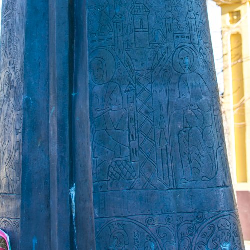 "Raffay Béla – 2000. augusztus 20-án leleplezett – alkotása egyszerre több hagyományt idéz. Elődjeinek tekinthetjük például a korai gótikus ötvösművészet legszebb darabjait; a szobor feje a győri Hédervári-kápolnában található Szent László-herma mintájára alakult ki. A Szent István-i jelképek, a Szent Korona, a koronázási palást, a koronázási kard (a pallos) és a jogar szintén megjelenítődnek. A kolompszerű, két oldaláról kissé nyomott harangra vagy subára emlékeztető, kúpos testre ráterül a koronázási palást, amely az egyik kézben tartott jogarral, a másik kézzel fogott, földbe leszúrt pallossal és a fejre helyezett koronával együtt azt a négy Szent István-i jelképet állítja elénk, melyek egyként jelentik történelmi, és persze szobrászati hagyományunkat is.