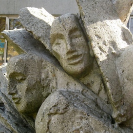 A szörnyűséges vérengzés folyamata sűrűsödik bele a legmodernebb módi szerint megformált, nem szoborszerű szoborba. Hullnak a fejek, az időkerékbe befagyott pillanatok kővé dermednek. A térdre kényszerített áldozatokat lekaszaboló hóhérpallos körbejár, és a halálkerék kibomlik, mint egy rózsaszirom.