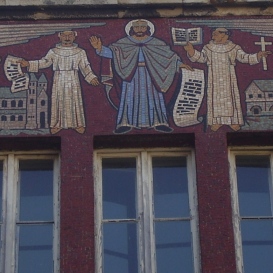 A mozaik részletén az építészet megjelenítése látható (körző, tervrajz, kész épület, ebben az esetben egy templom)