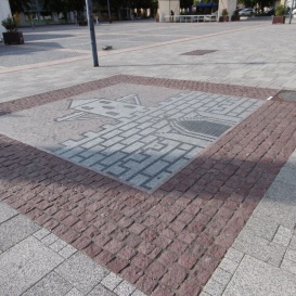 A sima szürke térburkolatban itt recés vörös kövekkel szegélyezték a torony emlékét hirdető mezőt. Ebben van kis négyzetes kődarabkákból kirakva egy ábra: egy városfal szakasza, csúcsíves városkapuval. Felül egy torony van, öt ablakkal, balra és jobbra egy-egy kinyúló erkéllyel. A kis kőnégyzetek színe fekete, világosszürke és halványvörös.
