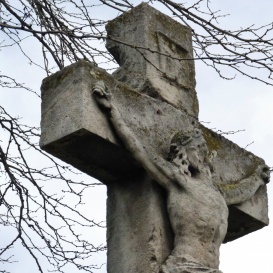 A kereszt és a talapzat találkozásánál egy koponya látható.