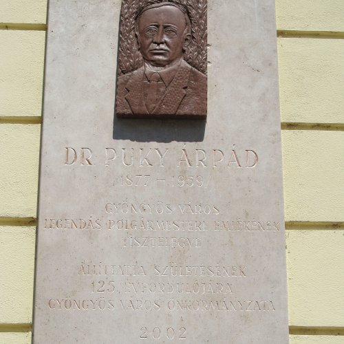 A városháza Dr. Puky Árpád u. felőli falán láthatjuk az egykori polgármester emléktábláját. A vörös márványból készült emléktáblán egy portré is található. Az emléktábla szövege: 2018.11.23. 01:36