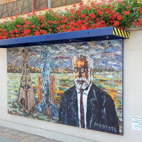 A festményen dr. Pávai Vajna Ferenc portréja van a középpontban, mellette megjelenik a felszínre törő víz, távolabb a fúrótorony is.