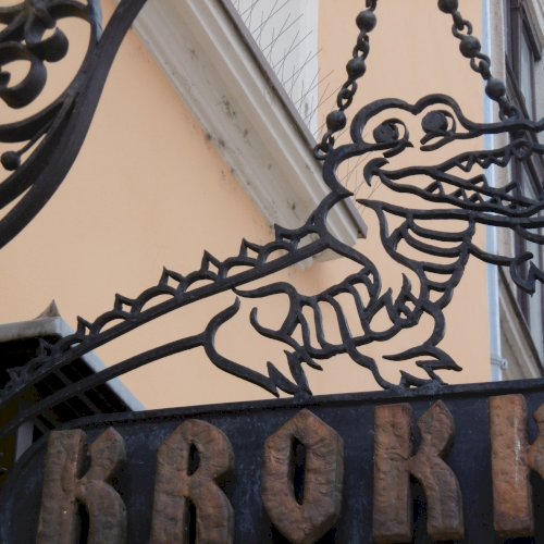 Már a kovácsoltvas tartószerkezet is szépen díszített. Láncokon lóg le erről egy krokodil. Pikkelyes hosszú farka és kitátott szája van. Az alatta lévő vasszerkezetre réz betűkkel ezt írták: KROKKO.