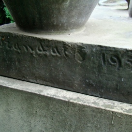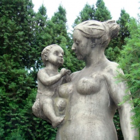 190x190x5 cm kő medence, 120 cm kő talapzat, női akt gyermekkel, korsóval, alumínium, 250 cm. Szép környezetben, víz nélküli medencével.