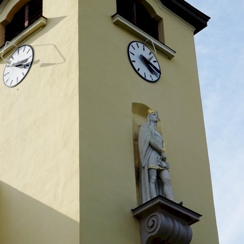 A torony homlokzatán kialakított nem túl mély szoborfülkében az ifjú király alakja látható. Fején koronát visel, oldalán kard. Tulajdonképpen az ember hajlana rá, hogy Imre herceget lássa meg benne, de a fején viselt korona anjou liliomai pontosítja a képet. A kezében tartott töviskoszorú a fent leírt mélyen megélt és gyakorolt vallási életére utal.