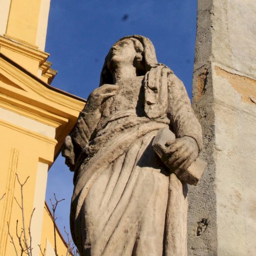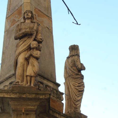 A talapzat oldalán háromszögek csúcsain három nőalak áll egyikük kezében egy nagy horgony a remény jelképe, egy másik alak kezében a könyv, a tudás az apostolok és evangélisták jellegzetes attribútuma. Végül a harmadik nő egy kis gyermekkel látható a hátsó részen peremén. Sajnos forrás nélkül nem voltam biztos az alakok beazonosításában ezért inkább nem írtam konkrét neveket. Az alakok életnagyságúak a remény a hit és a szeretet allegorikus alakjai.