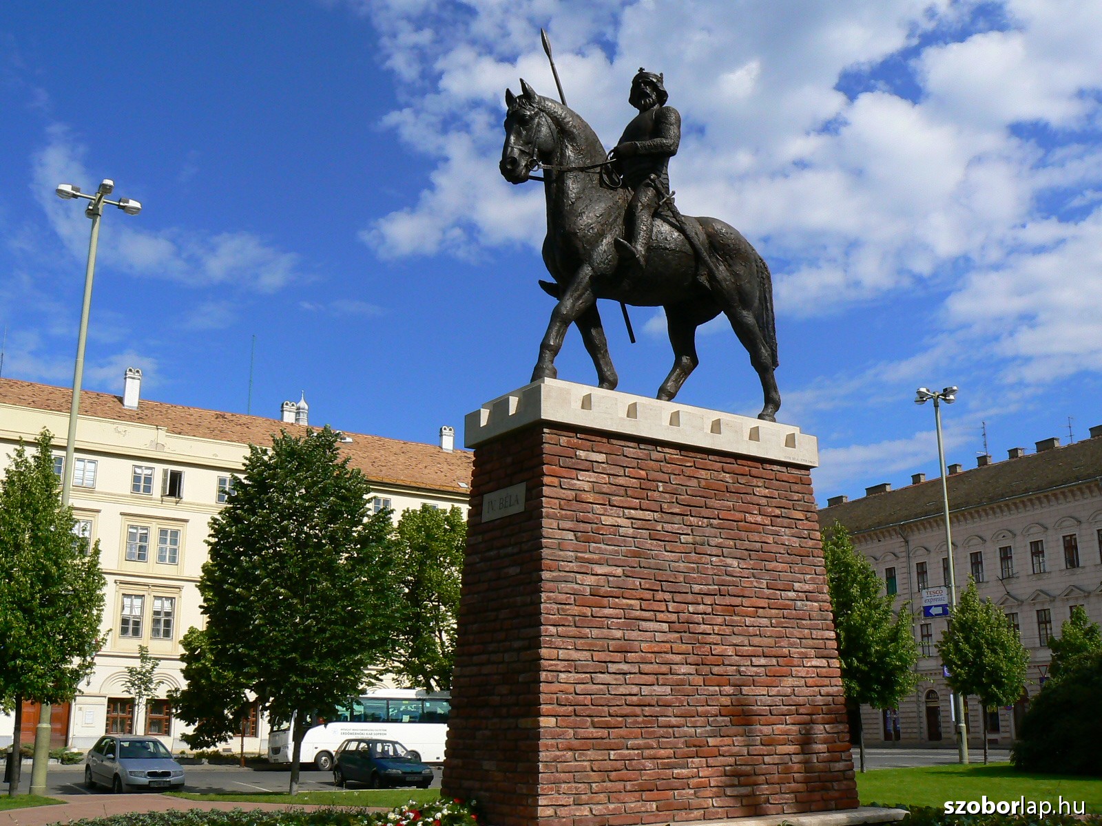IV. Béla 1:1 léptékű lovasszobrát a csongrádi szobrászművész, Tóth Béla és fia, Dávid készítette. Talapzatával együtt a mű összesen 7 méter 80 centiméter magas. Az uralkodó a Kárász utca felé tekint.