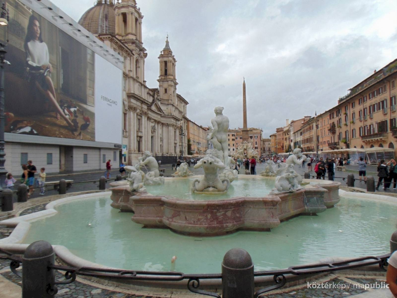 A tér közepén a Négy folyó kútja áll, melynek karcsú obeliszkje szinte felkiáltójelként vonzza a közép felé a tekintetet.