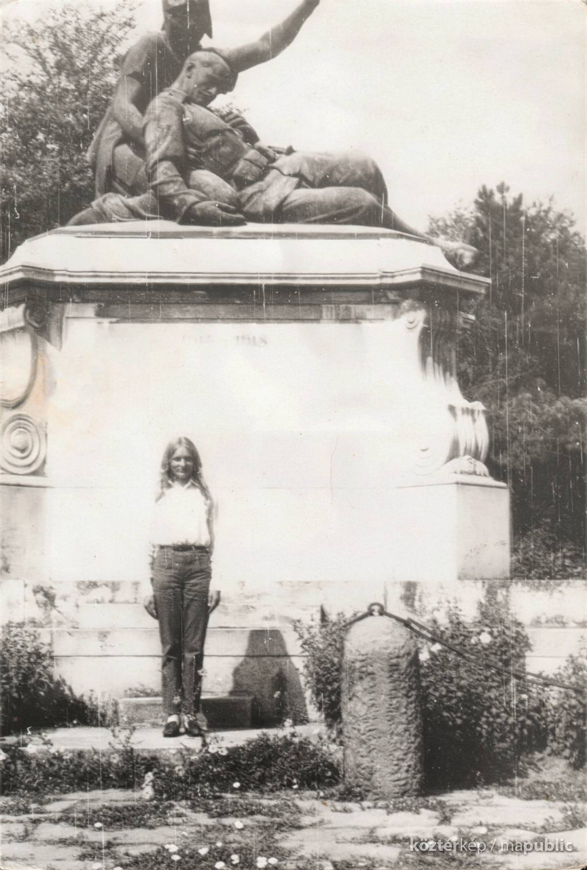 " A bronzszobor egy elernyedt izomzatú elesett katonát ábrázol, akit fekvő helyzetéből a mögötte térdelő Hungária egyik kezével felemel, másik kezével babérkoszorút tart fölé. A talpazat egyik oldalán Horthy Miklós kormányzó, a másik oldalán Tisza István domborművét helyezték el bronzból. Horthy domborműve alatt a felirat: „Vérével védte és romjaiból újra építette a hazát.” Tisza István domborműve alatt a felirat: „Hazájáért élt és halt vértanú halált.” A talpazat hátsó oldalán, márványtáblán megörökítve a hősök neve. Elől felirat: „1914-1918 Az nem lehet, hogy annyi szív hiába onta vért.” A lábazat anyaga haraszti kő, magassága 3 m, a teljes magasság 5 m. Az emlékművet 16 oszlopon függő lánckerítés övezi, a talpazat két domborművét 1945-ben eltávolították, az alattuk lévő feliratokat 1949-ben levésték."