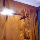 Az intarziák a színházi élet jeleneteit elevenítik fel, még a technikai részek bemutatására is figyelt az alkotó - aki egyébként díszlettervező is.