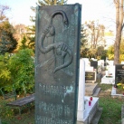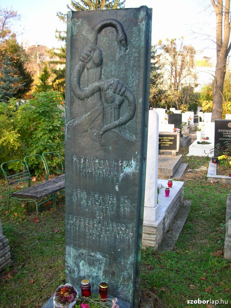 A síremléket díszítő vörösréz domborművet amin két kígyót tartó kéz látható Búza Barna szobrászművész készítette.