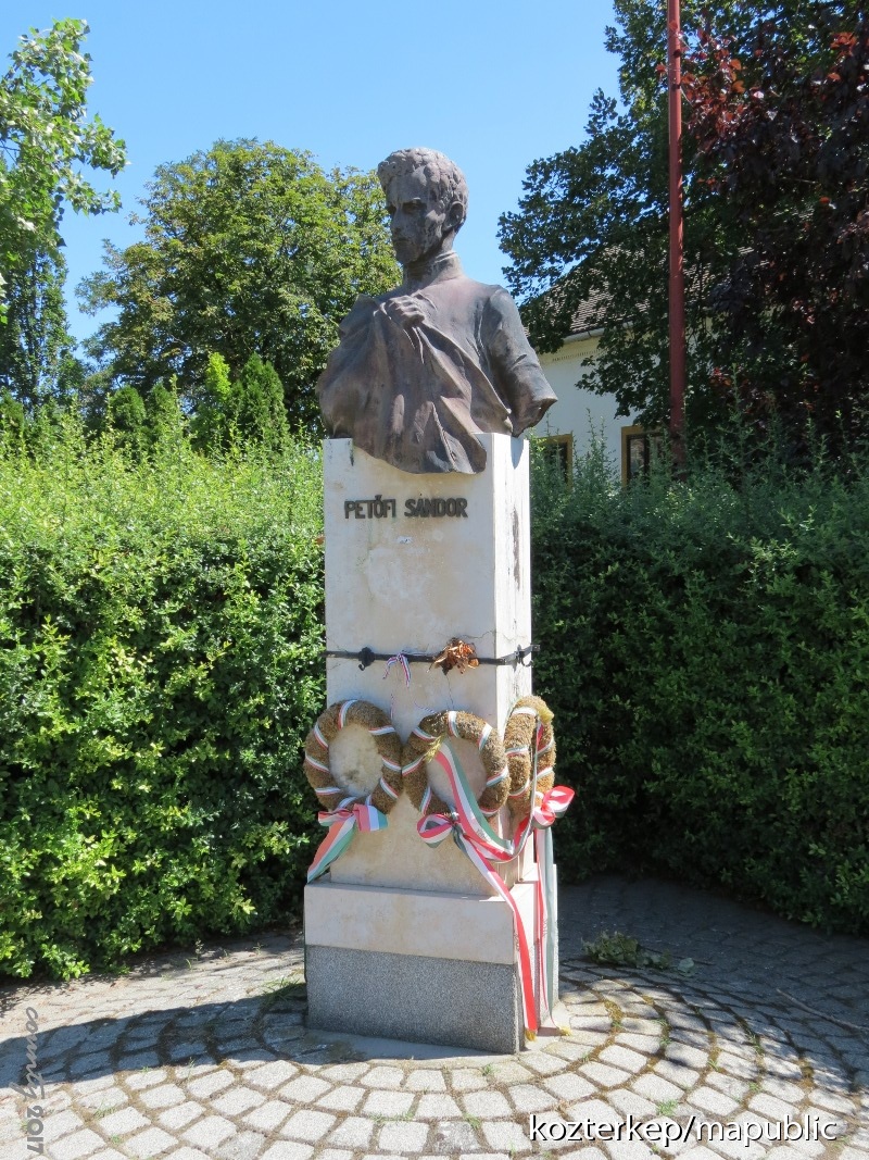 Bronz mellszobor (kb. 2 méter magas) négyszög keresztmetszetű műkő talapzaton, rajta Petőfi Sándor felirat.