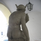 Hermész a görög mitológiában a 12 főisten egyike, az Istenek hírnöke, Zeusz és Maja nimfa gyermeke. Többek között a pásztorok, utazók, kereskedők istene. Általában szárnyas úti kalappal ábrázolják, (mint ahogy ezen a szobron is ) amit apjától Zeusztól kapott, amikor az utazás istenévé avatta fiát.
