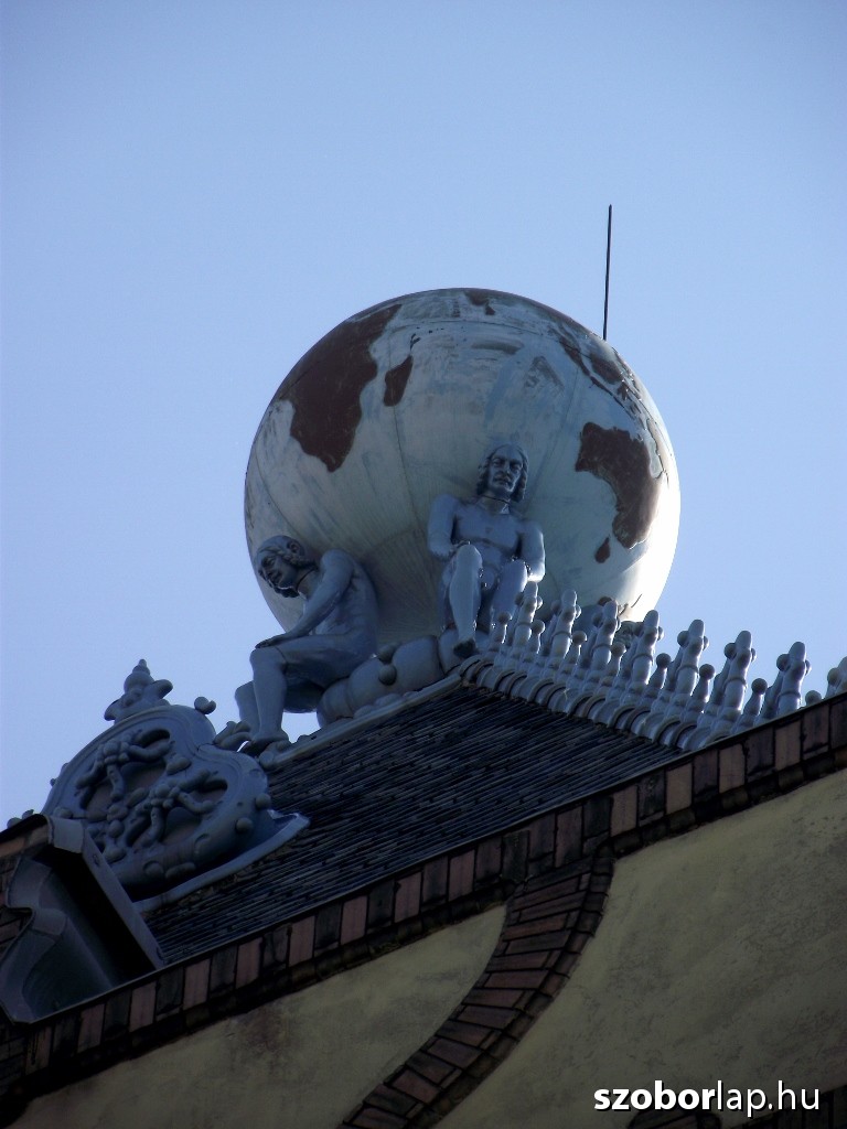 A központi helyen, a középső torony csúcsán látható a 'középrizalitot uraló hatalmas, ősmagyar figurák vállán nyugvó földgömb'. A négy figura a négy égtáj megtestesítője.