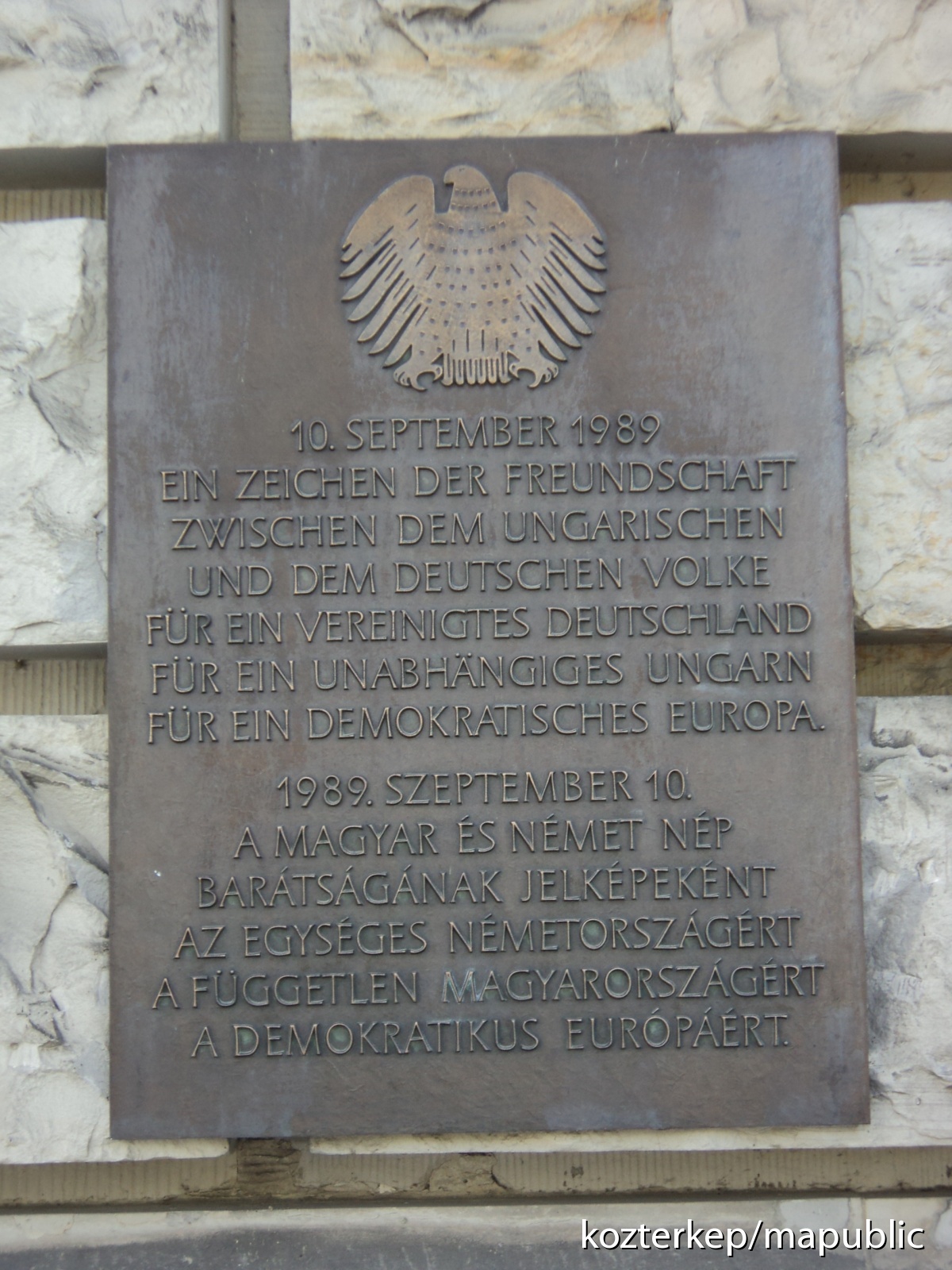 a berlini Reichstag homlokzatán (egyedüli idegen-nyelvű emléktáblaként) magyarul és németül emlékeztet az 1989-as rendszerváltásra, a két nép barátságára és a közös reményekre.' A Fotó és szöveg forrása: 'Anonym'.)Kevesebb szöveg