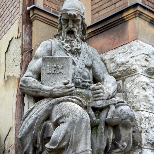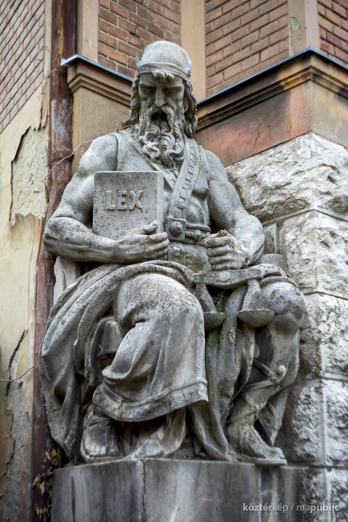 A hatalmas méretű ülő férfialak kezében könyvet tart, melyen a LEX (=törvény) szó látható - nem véletlenül, hiszen a szobor a Városi Bróság épületén található.
