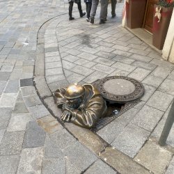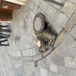 Könnyű megtalálni, mert állandóan fotózzák a turisták. A sisak gombja ragyog a sok simogatástól.