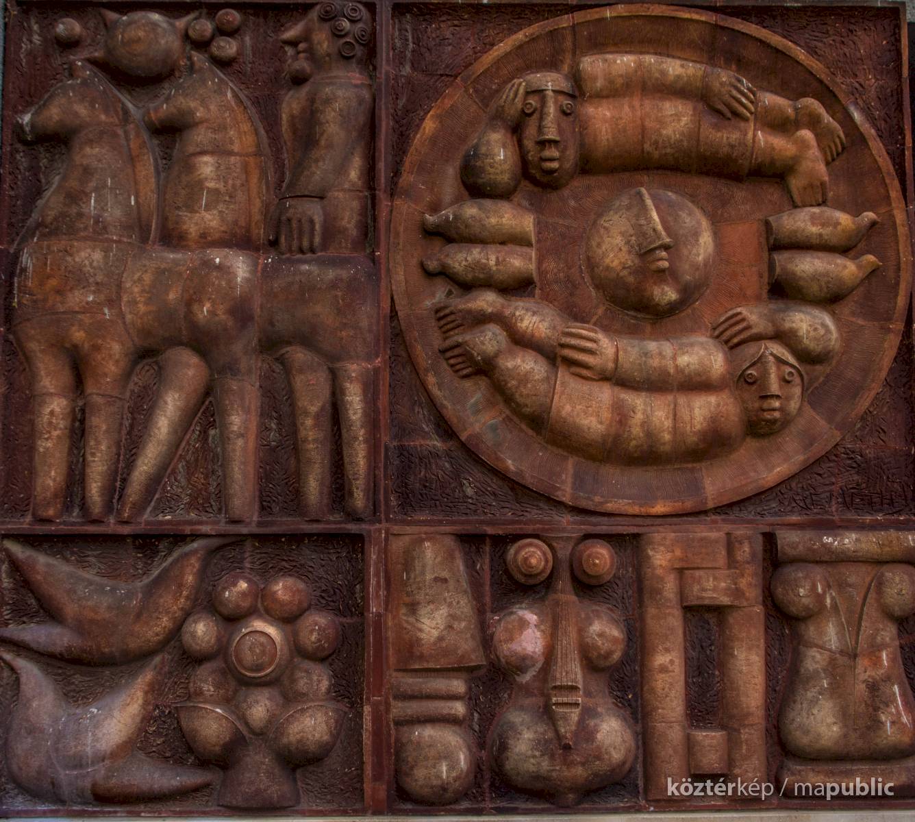 "A dombormű mezőjét négy, eltérő nagyságú részre osztott ikonosztázként felfogva Némethnek lehetősége nyílt a tartalom tömörítésére. A tematikát átlósan szervezte meg, a bal átló a római korra utal, a jobb az élet örök megújulására és fejlődésére. A legnagyobb mezőt a jobb felső sarokban a művész kedves motívuma, a tél és a nyár, az éjszaka és a nappal, a fiatalság és az öregség körforgásának - a saját maga kör formájával is - folytonosságát hirdető, férfi és nőalakot magába foglaló jelképe tölti ki. Sokszor visszatérő, tartalmilag rendkívül összetett és kiérlelt motívum ez, melyet a népművészet bölcs szűkszavúságával fogalmazott meg. Vele átlósan szemben magjából kibúvó virág és két szabadon repdeső galamb mélyíti az életigenlést. A bal felső sarokban fegyelmezett római két lóval, szigorú profilból, merev tartással, szemben vele archeológiai motívumok értelmezik a jelenetet: oszlopfő, idolszerű szobortorzó. Plasztikailag izgalmas kérdést vetett fel a két, egymás mellett álló ló és a mögöttük lévő emberalak térillúzióval, vagy annak hiányával történő megfogalmazása. Ezt Németh magától értetődő egyszerűséggel, csupán az oldalról látszó részek egy síkba vetített ábrázolásával oldotta meg, fittyet hányva a perspektíva törvényszerűségeire, egy jóval ősibb, de nem kevésbé hatásos ábrázolási sémához nyúlva vissza."