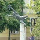 A szobortest csak egyetlen kicsiny ponton érintkezik a vékony kőoszloppal: ez a repülés illúzióját is erősíti és egyben a vízszintes és függőleges elhelyezés sajátos szintézisét teremti meg. Nagy kár, hogy a fiatal, de sikerekben máris gazdag művész alkotása nem a legszerencsésebb helyen áll túlságosan távol esik, ha elölről nézzük, a Nagytemplom felől pedig fák akadályozzák a zavartalan rálátást.... Sz. J."