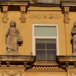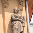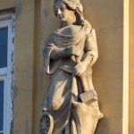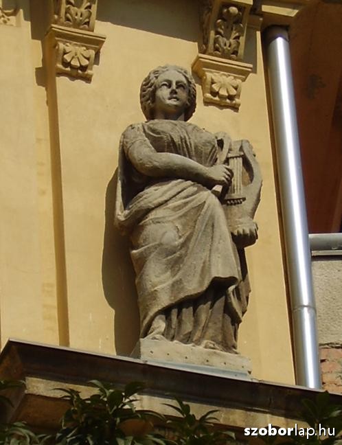 Az allegorikus nőalakok közül – melyeket magamban csak múzsáknak hívok, bár számuk alapján nem azok – ez a figura lehetne akár Terpszikhoré, a tánc, táncművészet múzsája is, mivel az itt látható alkotás kezében lantot látunk. Így a tánchoz, táncművészethez köthető a kedves nőalak figurája. A szobor a homlokzattal szemben állva a jobb oldali torony alatt helyezkedik el, és a két itt látható alkotás közül ez a jobb oldali figura.