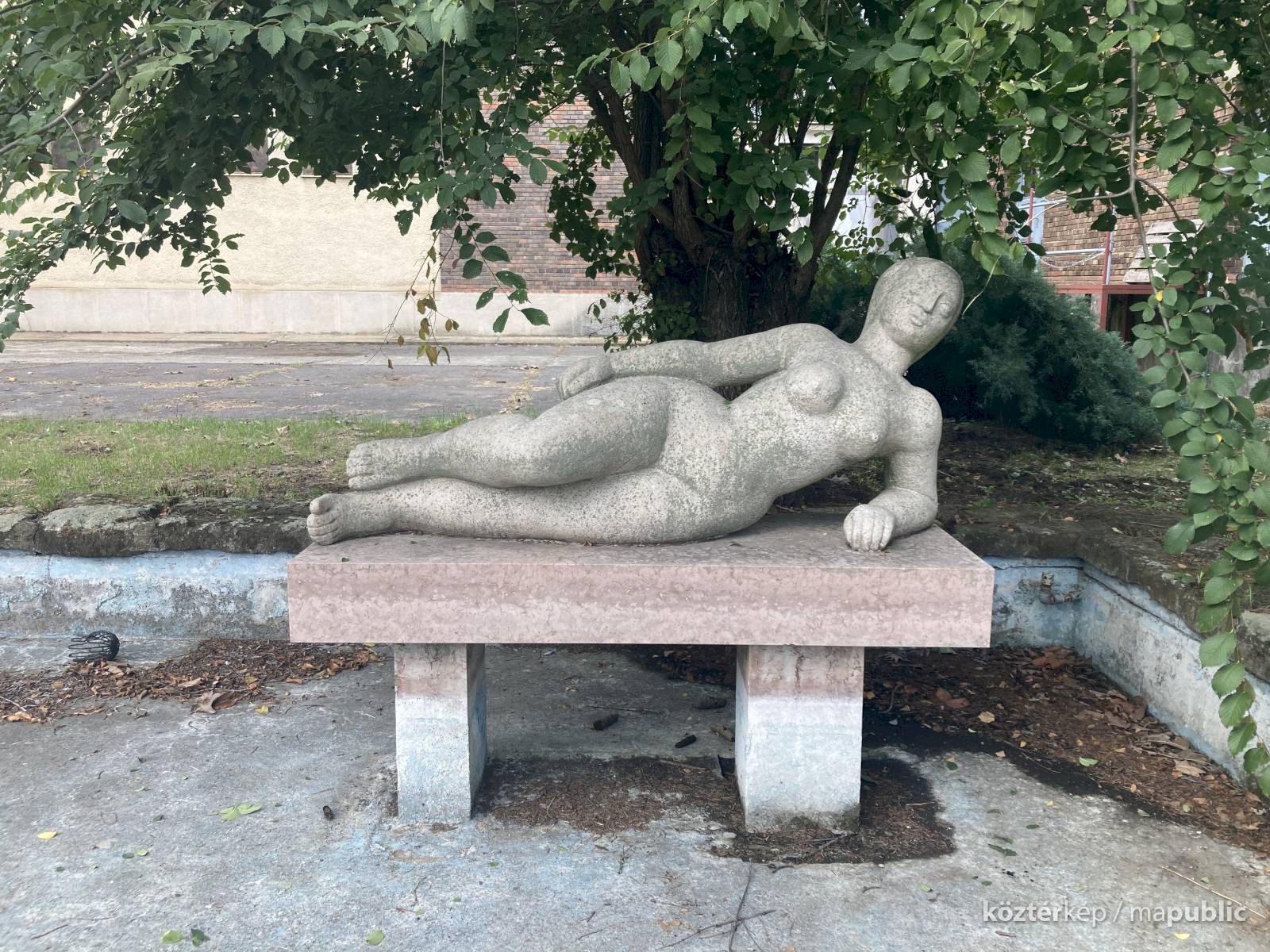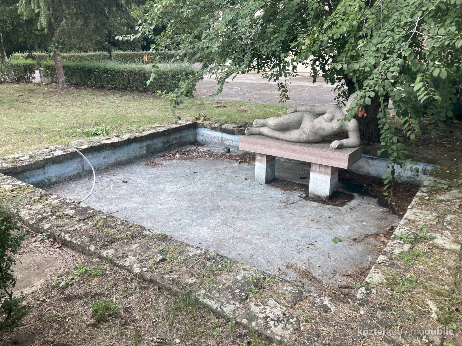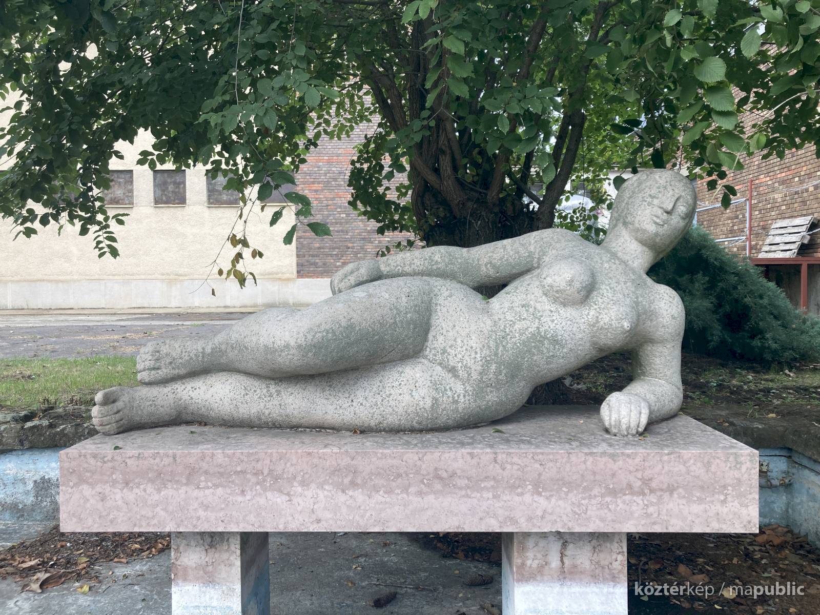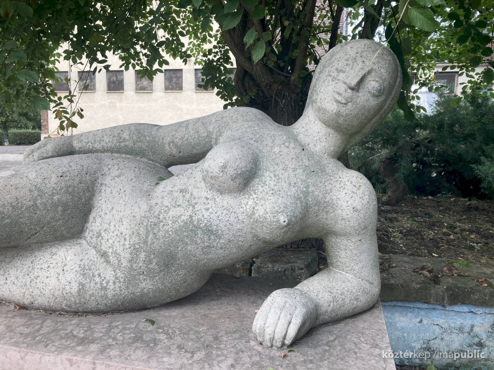 Szépen rendezett park fűzfái alatt, vízmedencében, padra hasonlító, vörös márvány posztamensen tűnik fel az életnagyságú heverő női akt, mely haraszti mészkőből készült. A baljára könyöklő, erőteljes nőalak az életöröm, a nyugalom megtestesítője _ írja róla Sz. Kürti Katalin Köztéri szobrok ....című könyvében (1977, 121. p.).