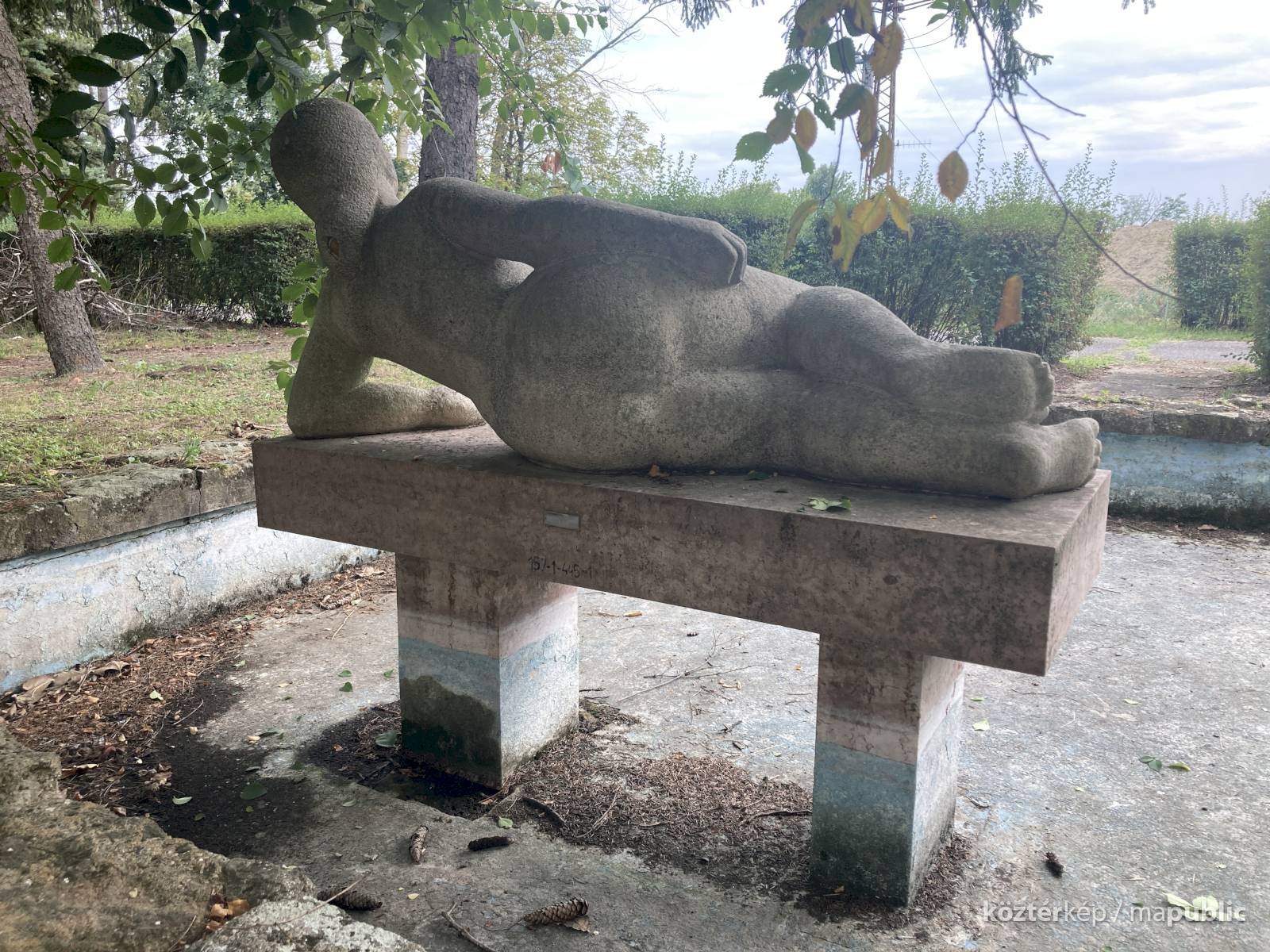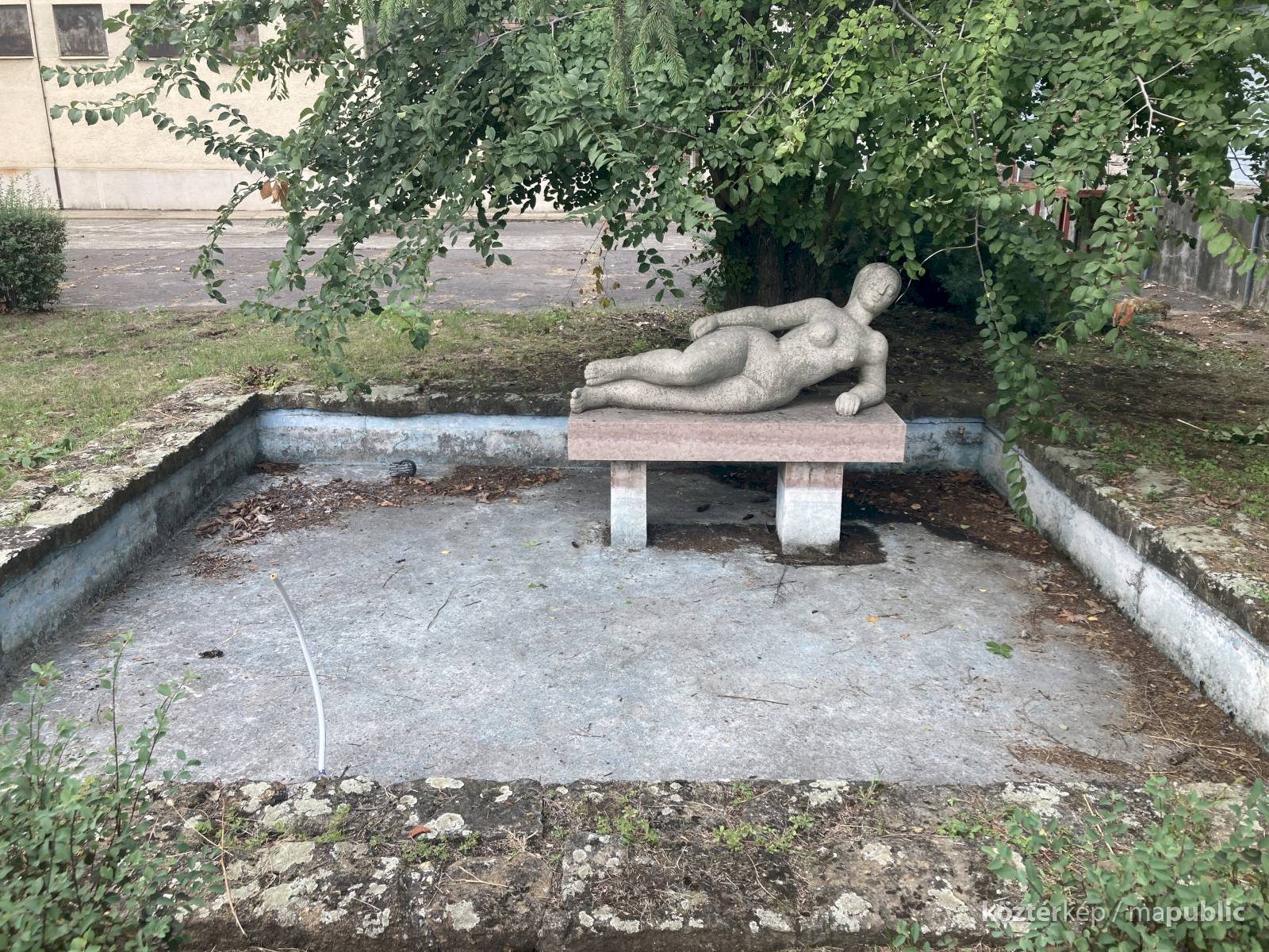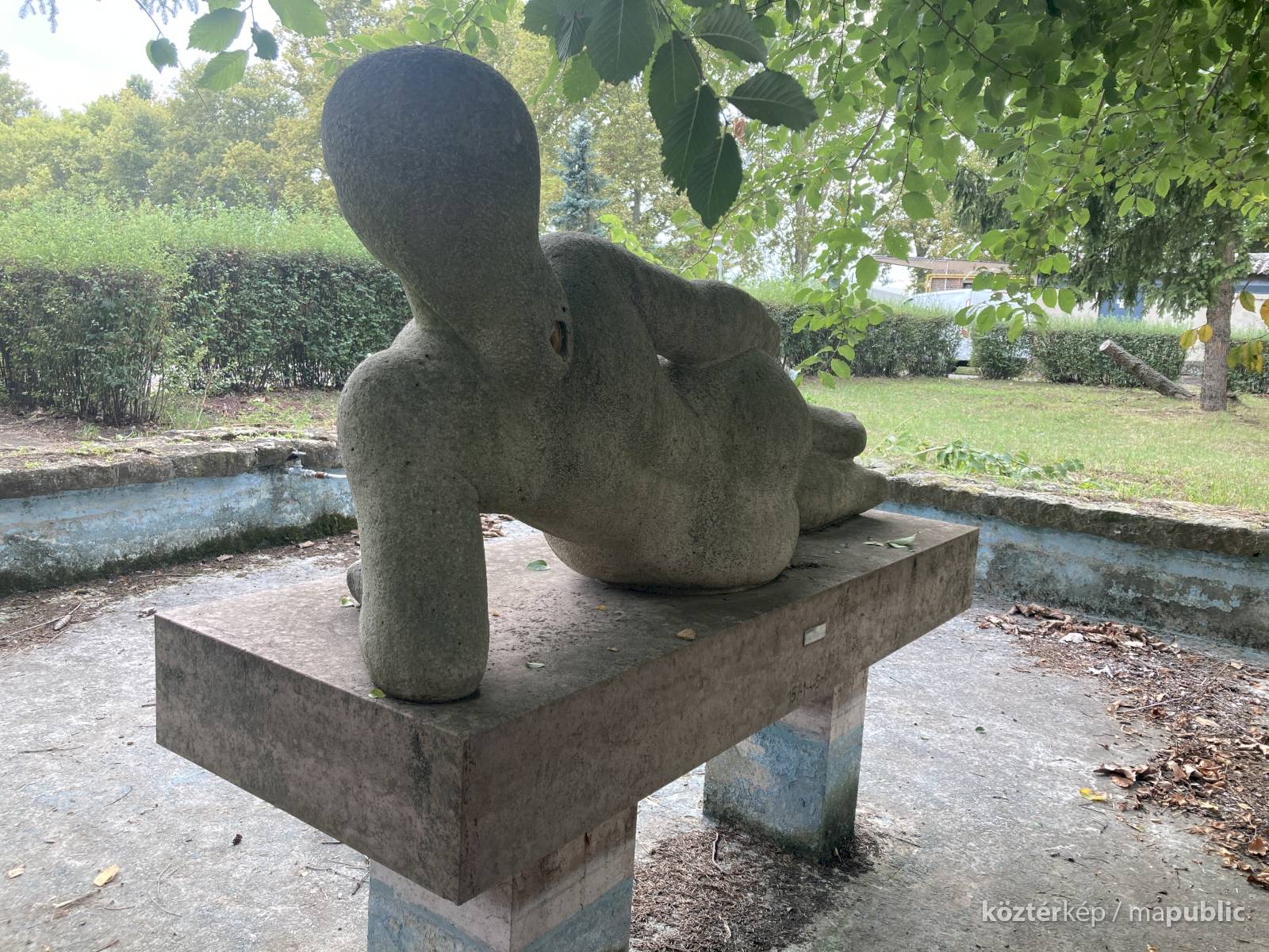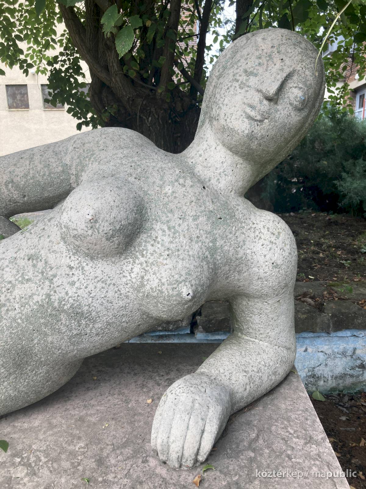 Szépen rendezett park fűzfái alatt, vízmedencében, padra hasonlító, vörös márvány posztamensen tűnik fel az életnagyságú heverő női akt, mely haraszti mészkőből készült. A baljára könyöklő, erőteljes nőalak az életöröm, a nyugalom megtestesítője _ írja róla Sz. Kürti Katalin Köztéri szobrok ....című könyvében (1977, 121. p.).