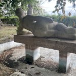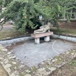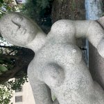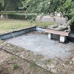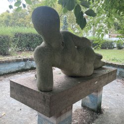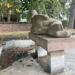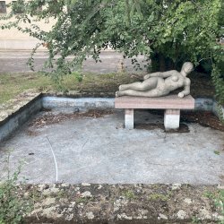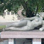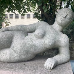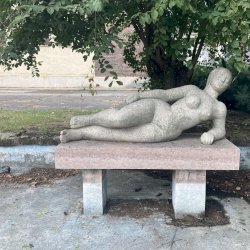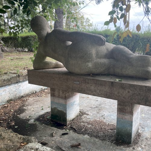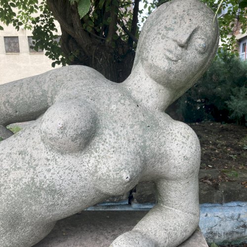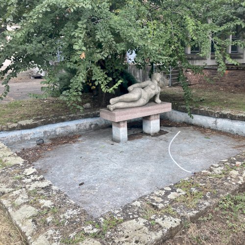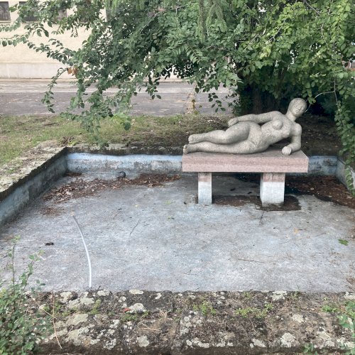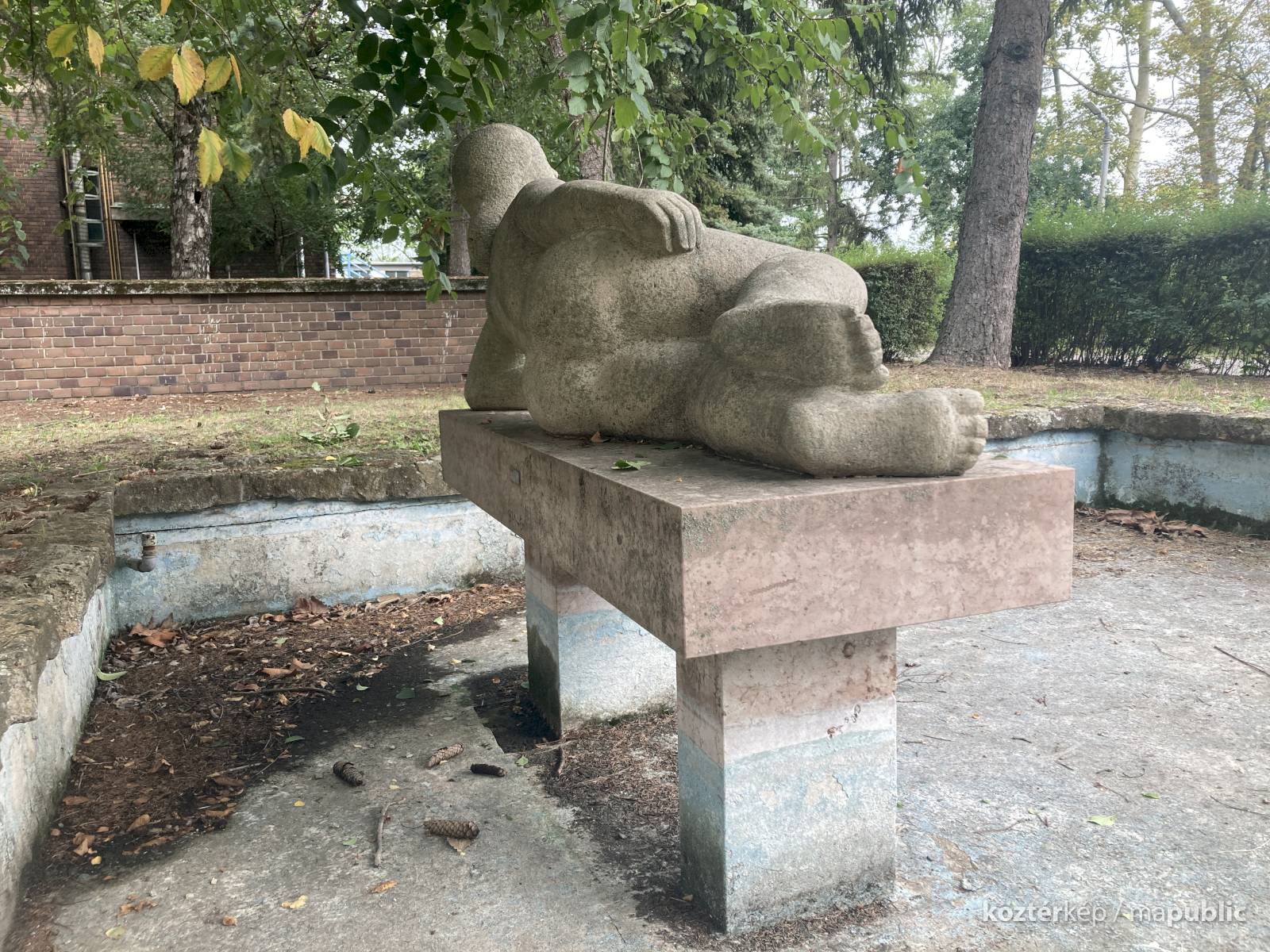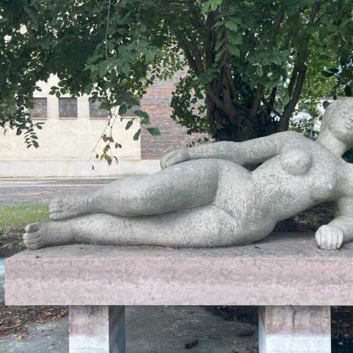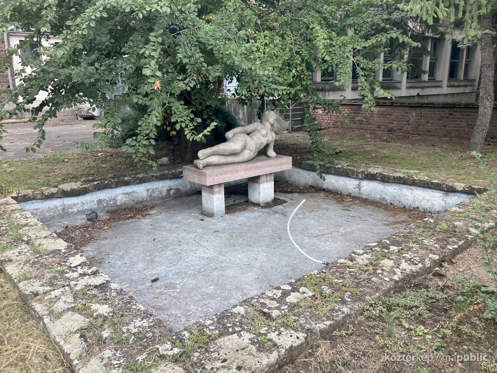 Szépen rendezett park fűzfái alatt, vízmedencében, padra hasonlító, vörös márvány posztamensen tűnik fel az életnagyságú heverő női akt, mely haraszti mészkőből készült. A baljára könyöklő, erőteljes nőalak az életöröm, a nyugalom megtestesítője _ írja róla Sz. Kürti Katalin Köztéri szobrok ....című könyvében (1977, 121. p.).