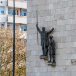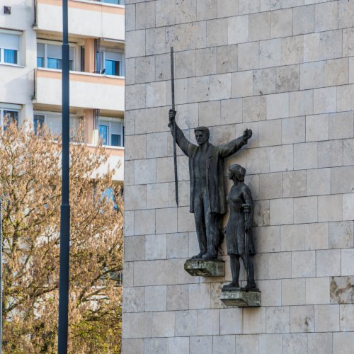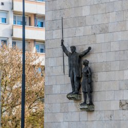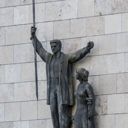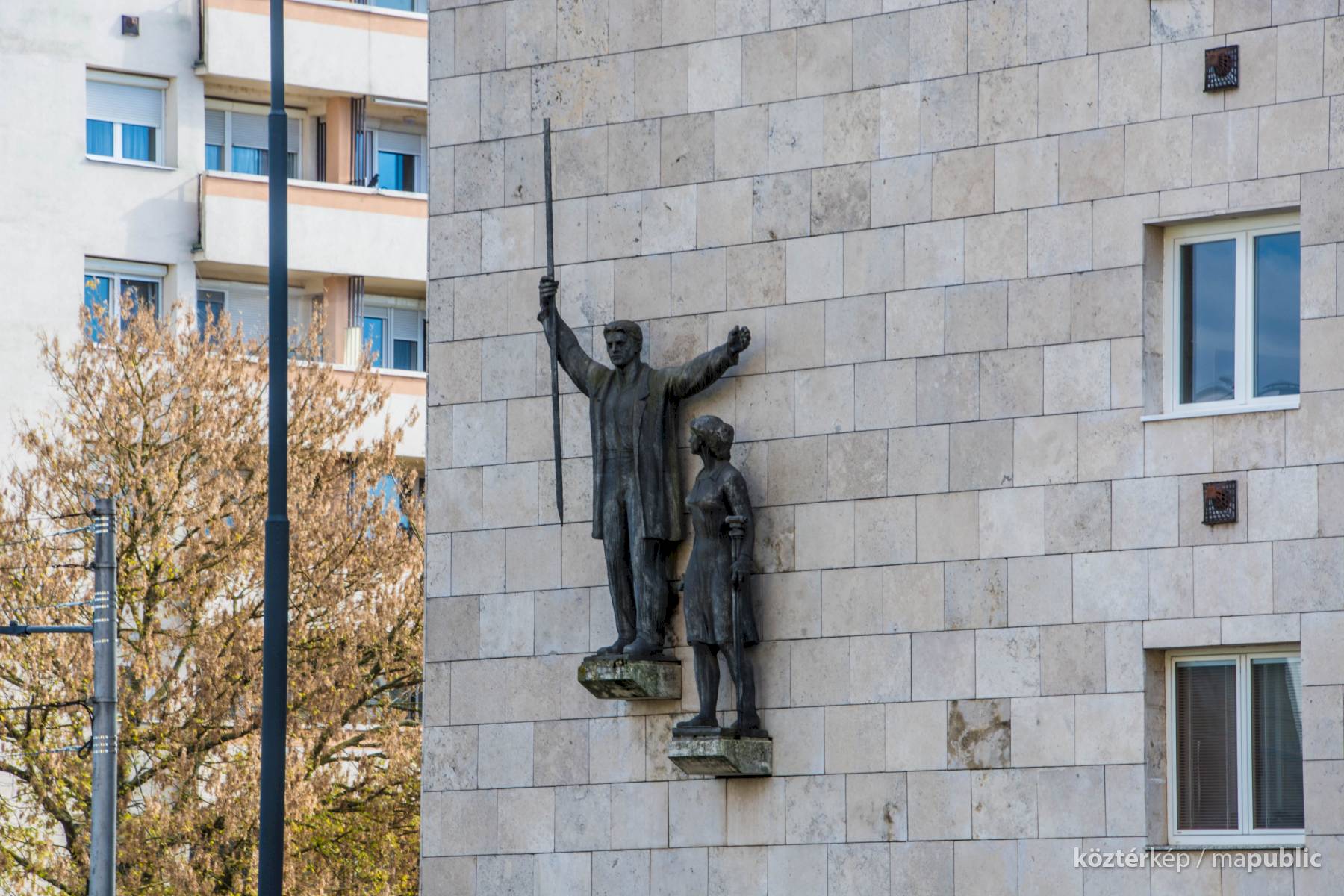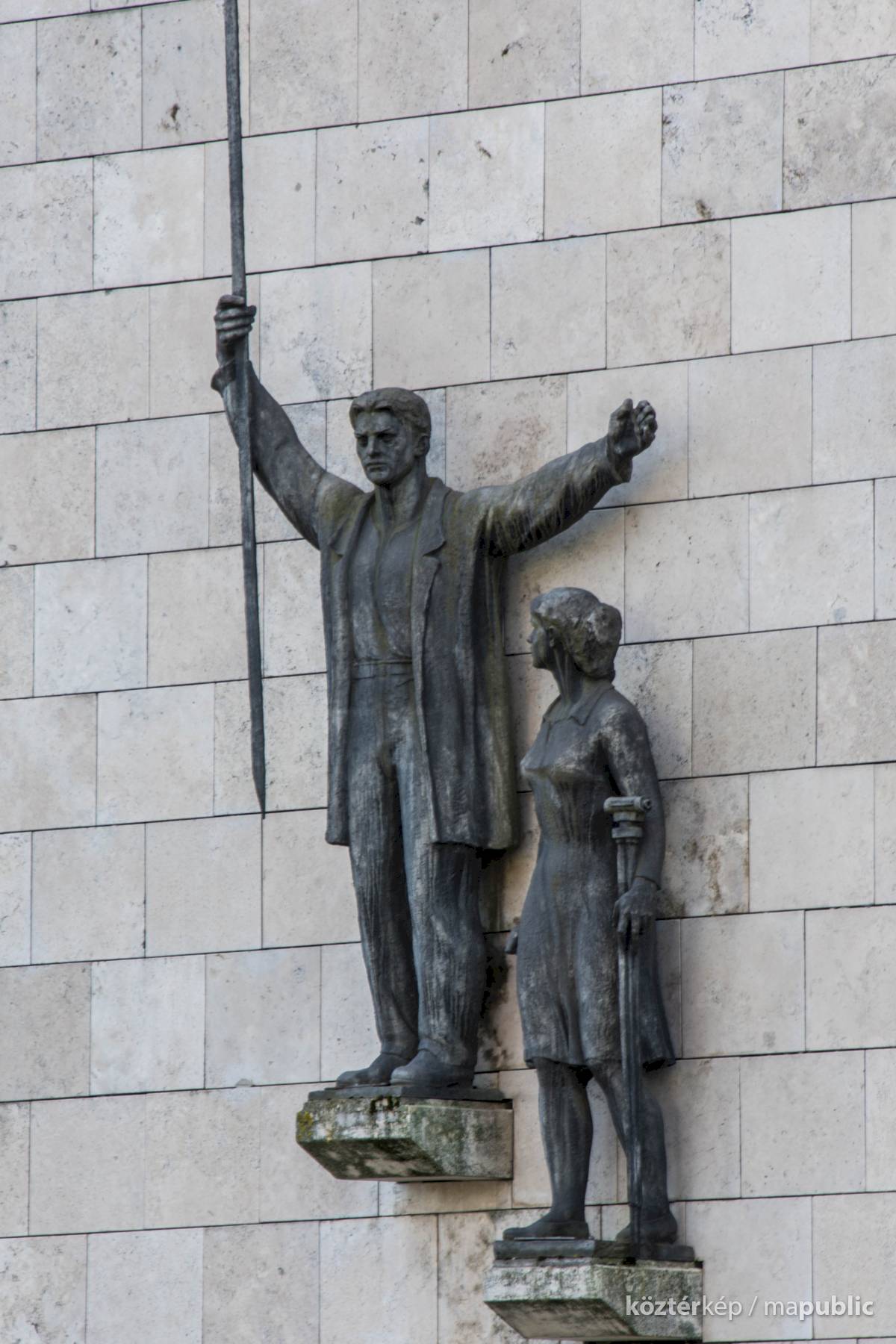 Az épület Balatoni út felőli, kővel burkolt északi falára, egy-egy kőkonzolra helyezett férfi és nő bronzalakja került. A férfi jobb kezében egy szintezőlécet emel magasba, míg a kissé lentebb elhelyezett női alak bal kezében földre helyezett szintezőműszert tart. A női figura kissé zártabb, a férfi nyitottabb.