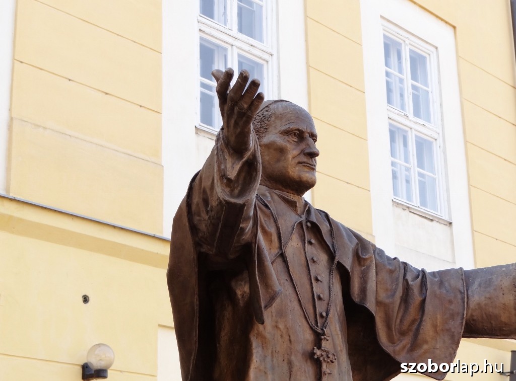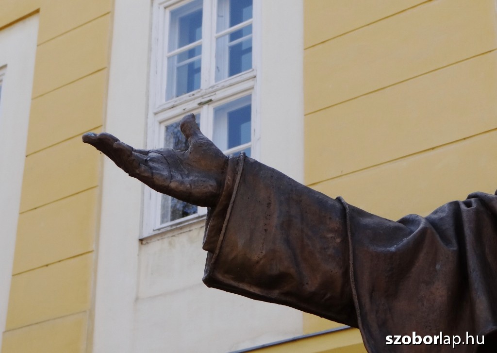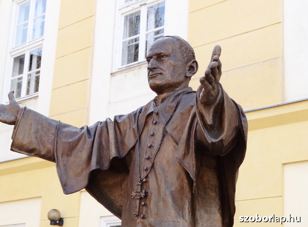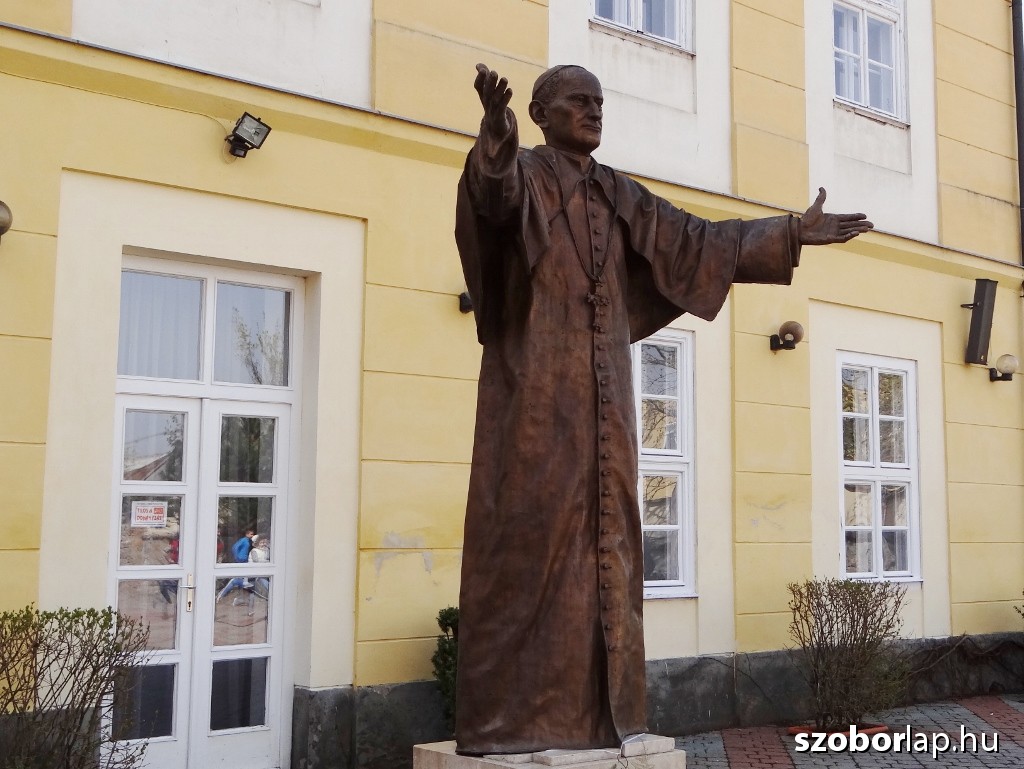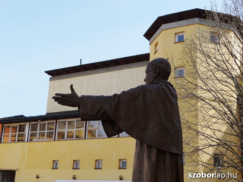 A szoborról legalább fél éve tudok, de 'csak' kb. egy hónapja jutottam el a nevét viselő esztergomi Katolikus Általános Iskolába, ahol engedélyezték a fényképezést. Az udvaron azonban az iskola tanulói sétáltak, beszélgettek. Őket kerülgetve sajnos nem tudtam olyan képet készíteni, ami a kb. 60 centiméter magas talapzaton álló életnagyságú alkotást mutatja.