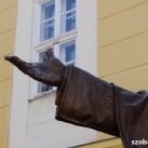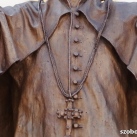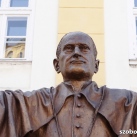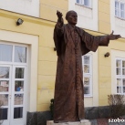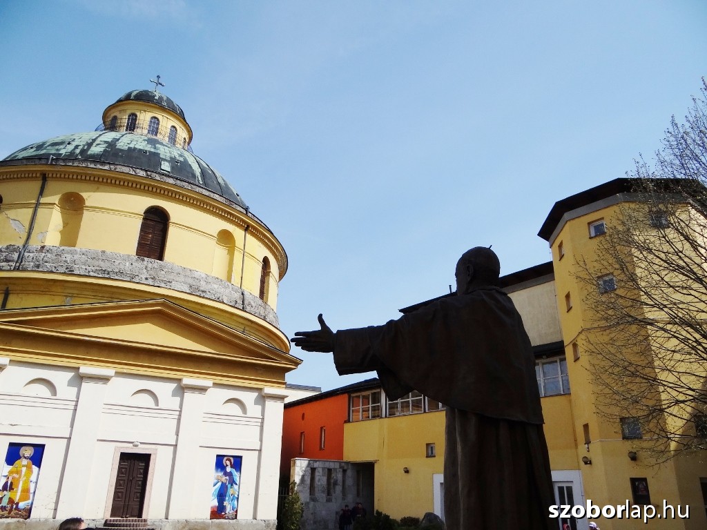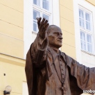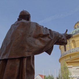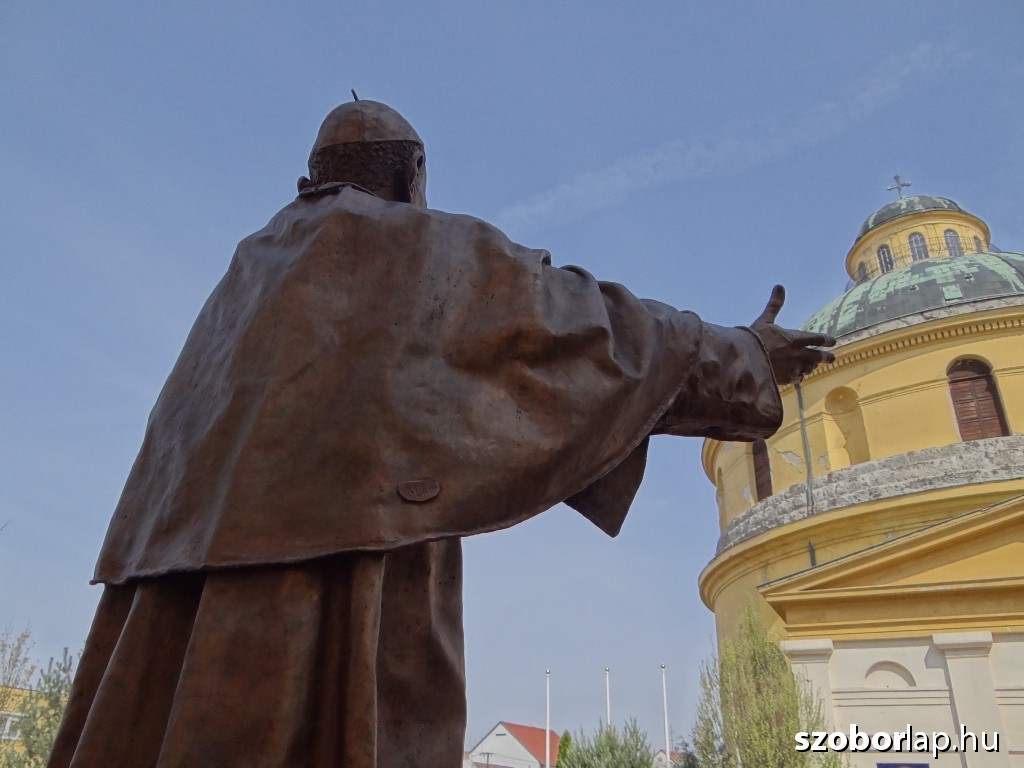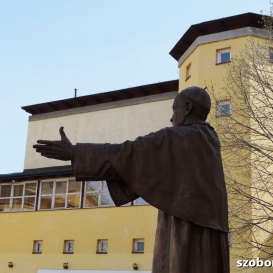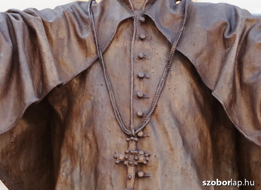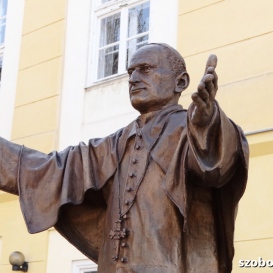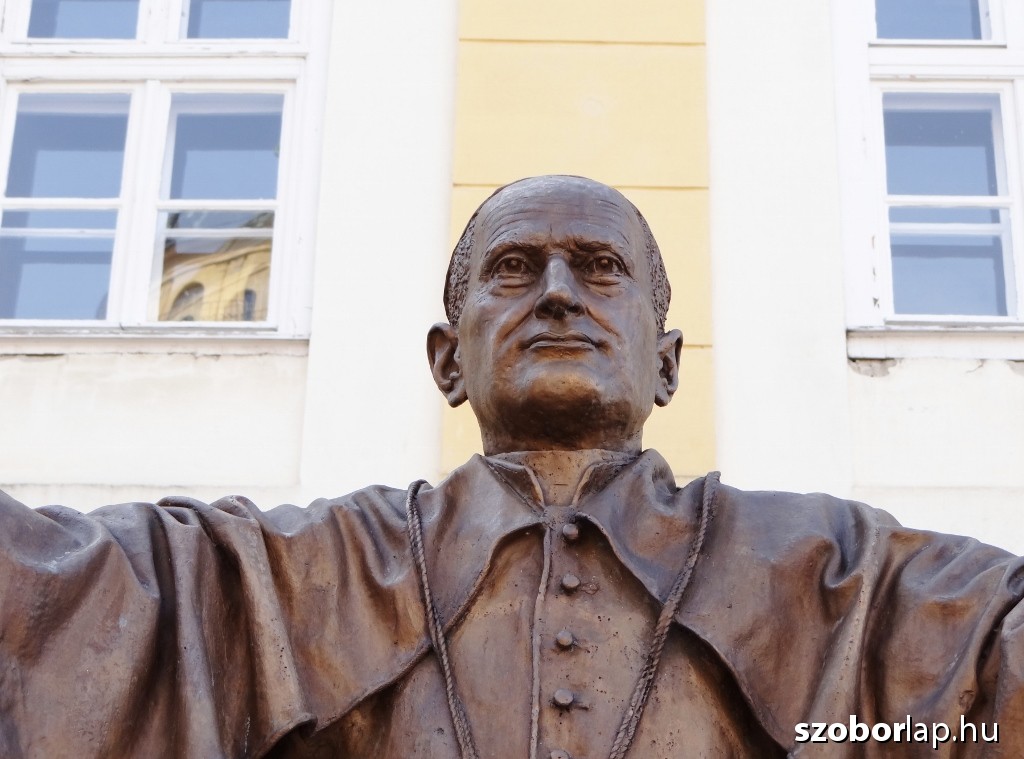 A szoborról legalább fél éve tudok, de 'csak' kb. egy hónapja jutottam el a nevét viselő esztergomi Katolikus Általános Iskolába, ahol engedélyezték a fényképezést. Az udvaron azonban az iskola tanulói sétáltak, beszélgettek. Őket kerülgetve sajnos nem tudtam olyan képet készíteni, ami a kb. 60 centiméter magas talapzaton álló életnagyságú alkotást mutatja.
