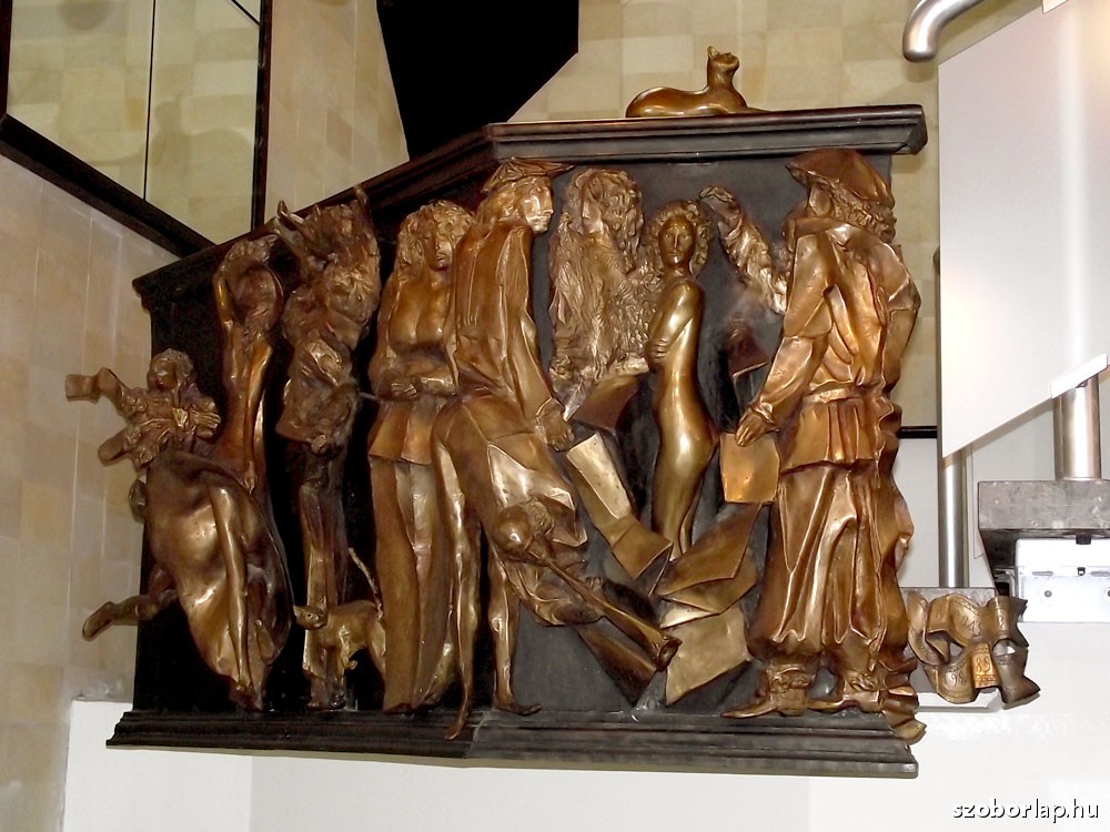 Borbás Tibor szobrászművész domborműve az első emeletre vezető lépcső oldalán található. A többalakos bronz kompozíció egy mozgalmas, kosztümös jelenetet ábrázol. A hegedűs és a két kedves cica jelenléte miatt talán a Hegedűs a háztetőn egyik jelenetét látjuk.