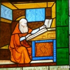 teljes szélességben és magasságban – Lantos Györgyi szobrász ólmozott, festett üvegablakot készített.