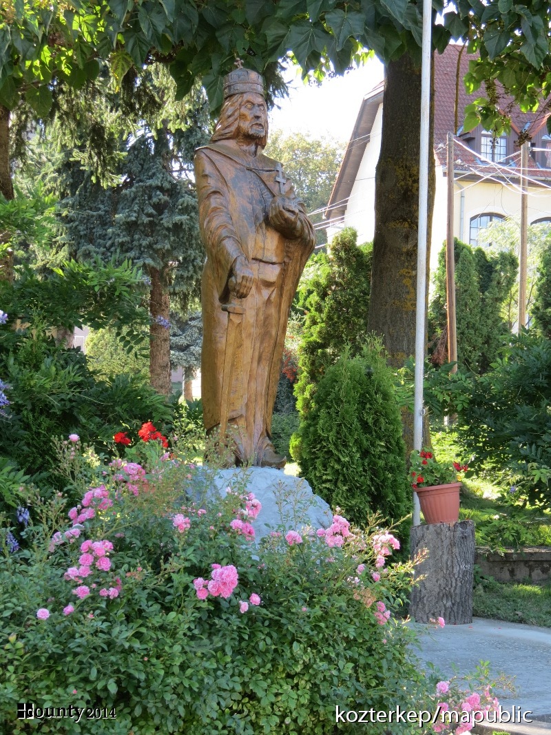 'A rendelkezésre álló farönk méretéből adódóan a szobor nem pontosan méretarányos, ellenben igényesen faragott, lásd a királyi koronát.'
