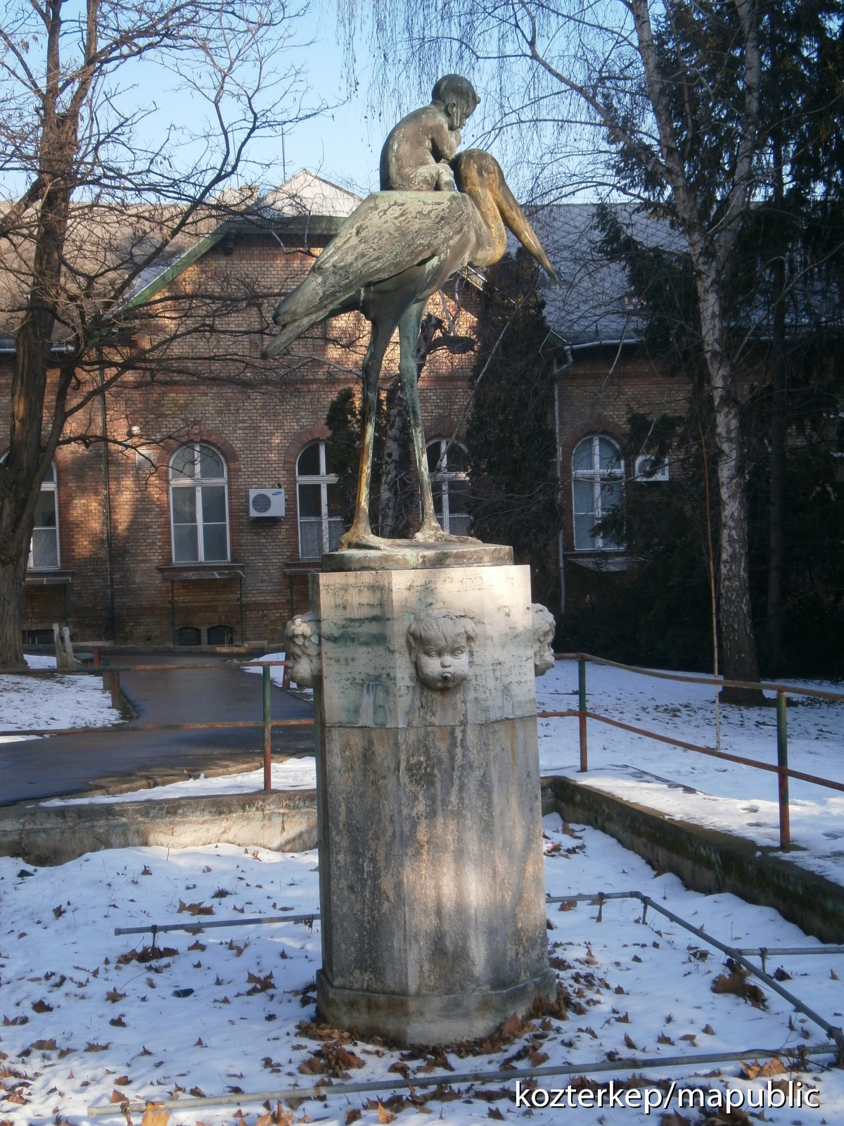 A szobor másik példánya Székesfehérváron a strandon áll 1935 óta (lásd a kapcsolt műlapot). A szobrok eredeti tervén nem medencében áll az alkotás, hanem egy kút része. A talapzatrészen eredetileg teljes alakos gyermek figurák szerepeltek, nem csak gyermekfejek.