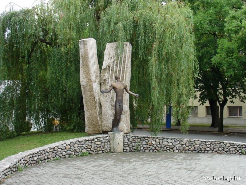 A mögötte álló 1956-os kopjafa a Béla térről került a szobor hátterébe.