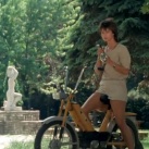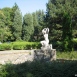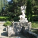 Kert közepén találtuk a fiatal izmos és vékony lányt egész alacsony talapzaton, szinte a földön térdel. Vállán korsó van, mint klasszikus szobrokon, de ez a mozdulat nála mintha idézőjelbe volna téve. A lába, keze kissé vaskos.