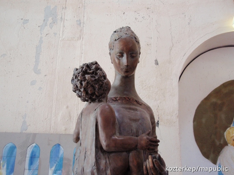 Megtaláltam. Az elhelyezés körülményeit mutatja az utolsó feltöltött kép. A templomban úgy tudják, gipszből készült az alkotás, a sekrestye feletti kóruson mutatták meg nekem.