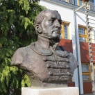 Szobra a Felsőbüki Nagy Pál Általános Iskola és Vendéglátóipari Szakiskola épülete előtt áll.