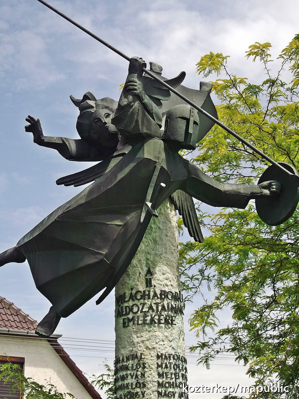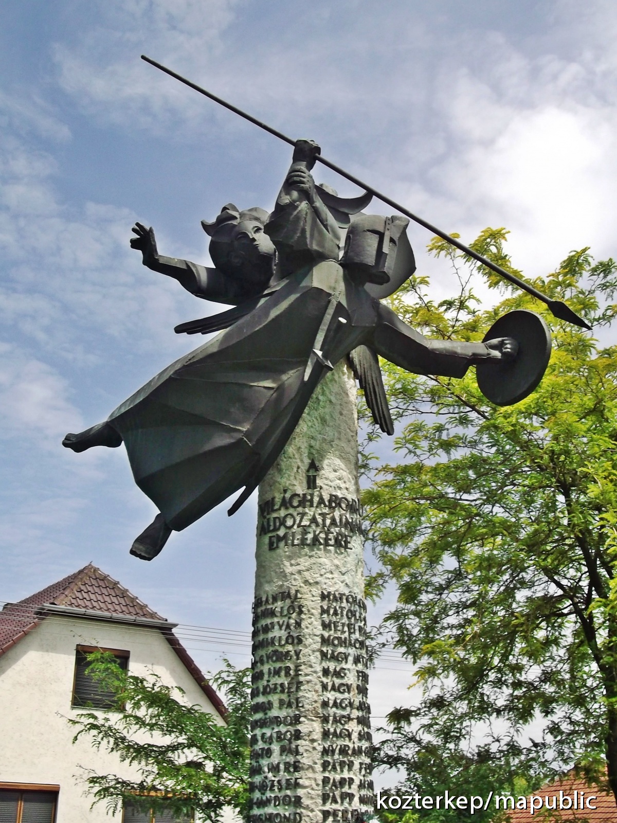 A II. világháborús áldozatok emlékére állított emlékmű három méter magas, henger alakú mészkőoszlop, melyen két osztatban helyezkedik el a hősök névsora. A kőoszlopon páncélban látható, pajzzsal védekező, dárdát vetni készülő háború rossz szellemét a puszta kezével és nyílt tekintetével, tiszta arcával igyekszik megfékezni a béke őrző angyala. A két alak ábrázolása mozgalmas, a viaskodást hűen kifejezi. Anyagjuk rézlemez, domborítva, hegesztve.