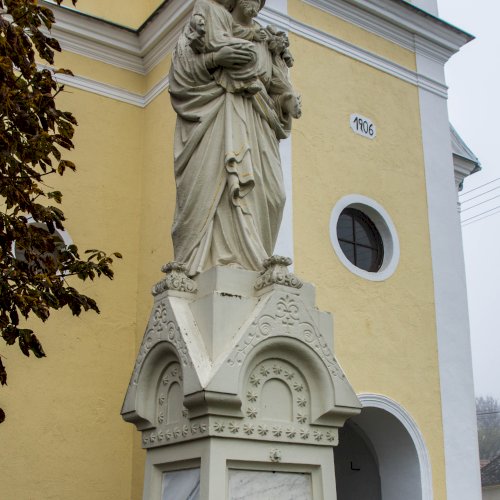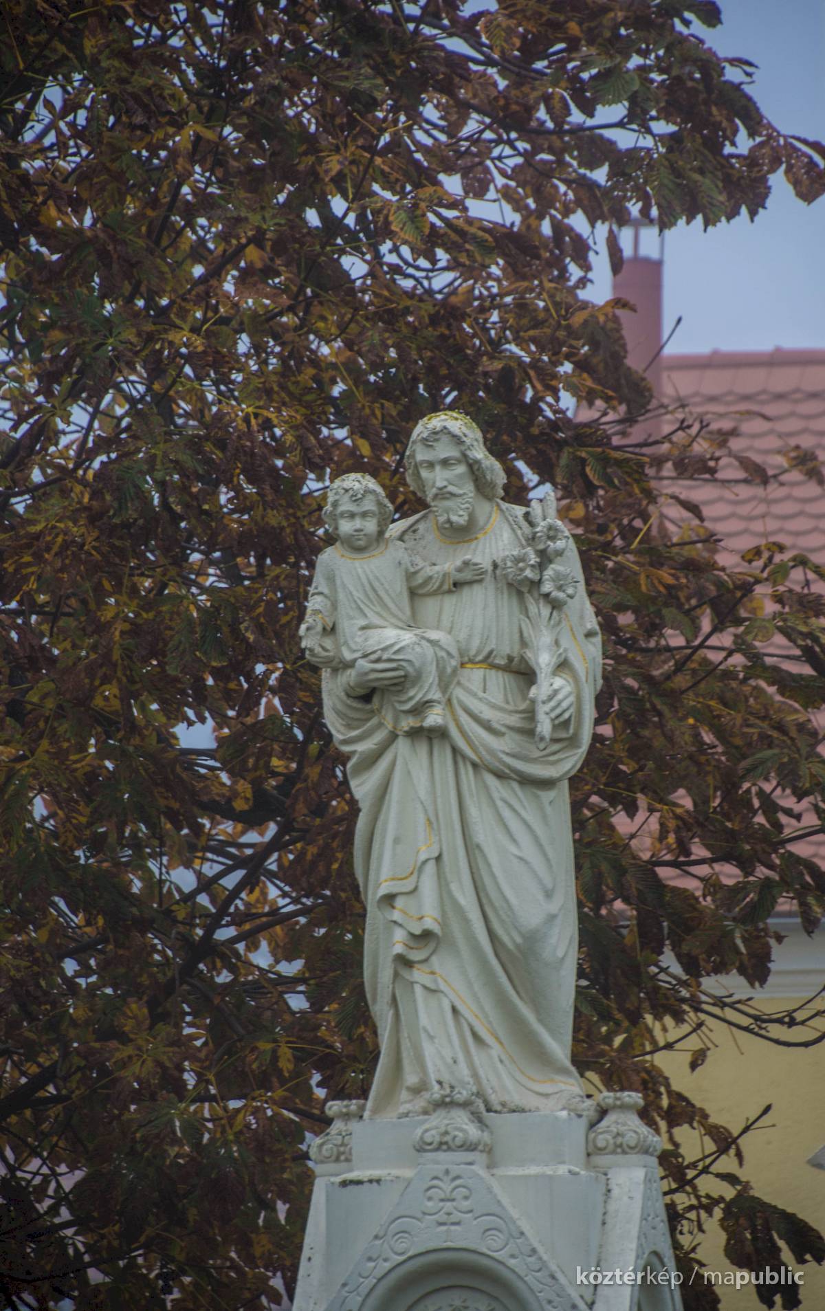A teljes életnagyságú alkotás magas talapzaton áll, Szent József karjában tartja a gyermek Jézust. A szobor részletgazdag kidolgozású, a talapzat felső részre is igényes munka. A talapzat alsó részét javították, a „Szombathely” feliratból itt csak a „ely” betűk olvashatóak. Bal oldalon egyértelműen olvasható a szobrász neve: Kondor.