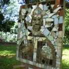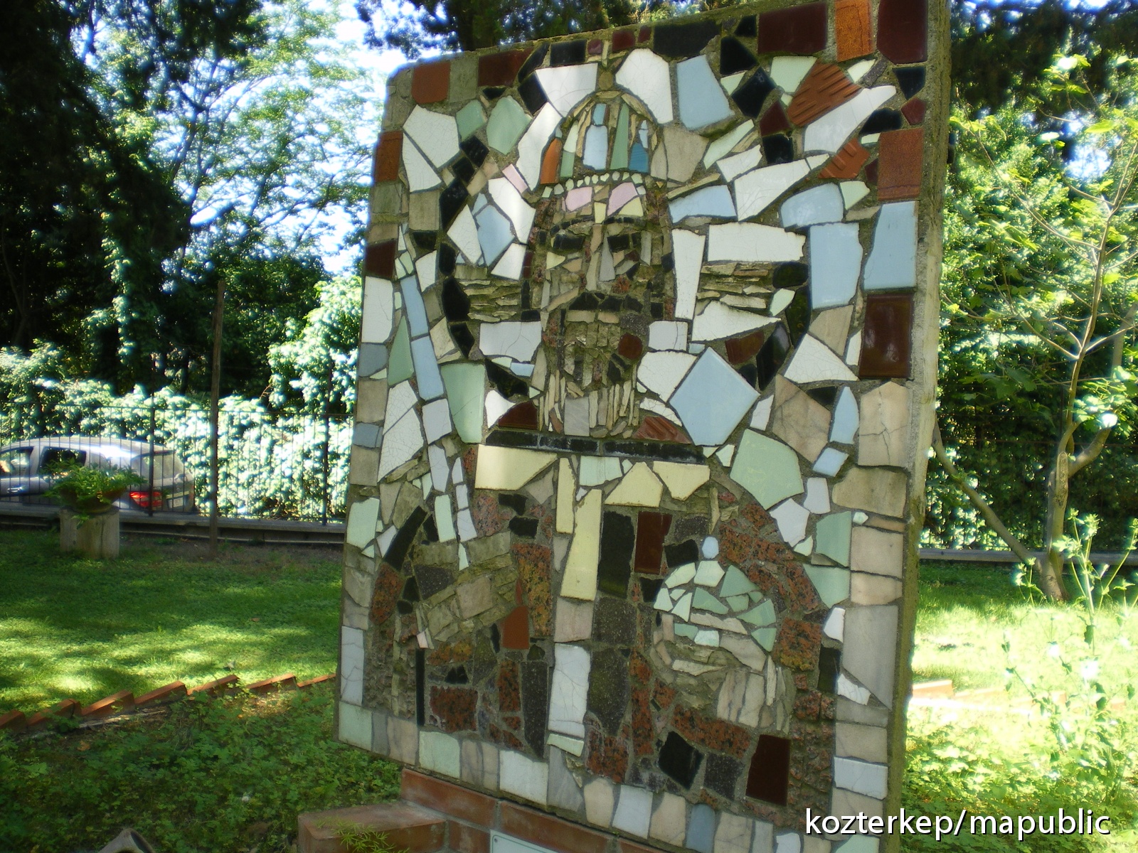 A kert bejárat felöli oldalán a fák takarásában két tégla talapzatú mozaikportré áll. Mindkettőnek egy és mégis különböző a témája: egy-egy ország védőszentjét ábrázolják. Mindegyiken kis tábla jelzi az alkotót és az ábrázolt személyt. Dátumot egyik sem jelöl.