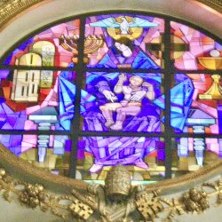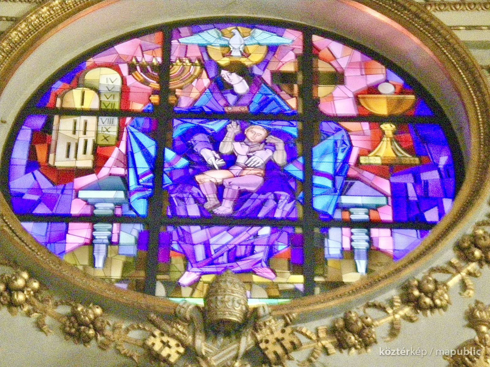A Bazilika homlokzatát díszítő festett üvegablak átmérője 450 cm.