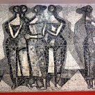 A könyvtár épülete 1966-ban lett kész (Tolnay Lajos tervezte). A mozaik egy évre rá készült el. A könyvtár kapui észak felé néznek, így ez az alkotás nincs olyan szerencsés helyzetben, mint a szentendrei, amelyik természetes fényt is kap. A szürke sok-sok árnyalatát felhasználva, a kövek nagyságának váltakozásával készült el a mű.