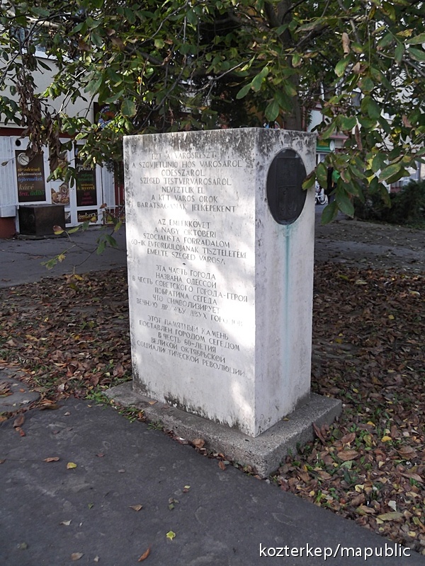 A csatolt linket Ády küldte azzal a céllal, hogy készítsek műlapot az emlékkőről, mert nem találja a szegedi műlapok között. Igencsak meglepődtem, mert úgy gondoltam régen fent van. Szinte naponta elmegyek mellette, még meg is szoktam nézni, mint régi korok megmaradt emlékét. A testvérvárosi kapcsolatról már nem hallani, de Odessza-lakótelepként még emlegetik.