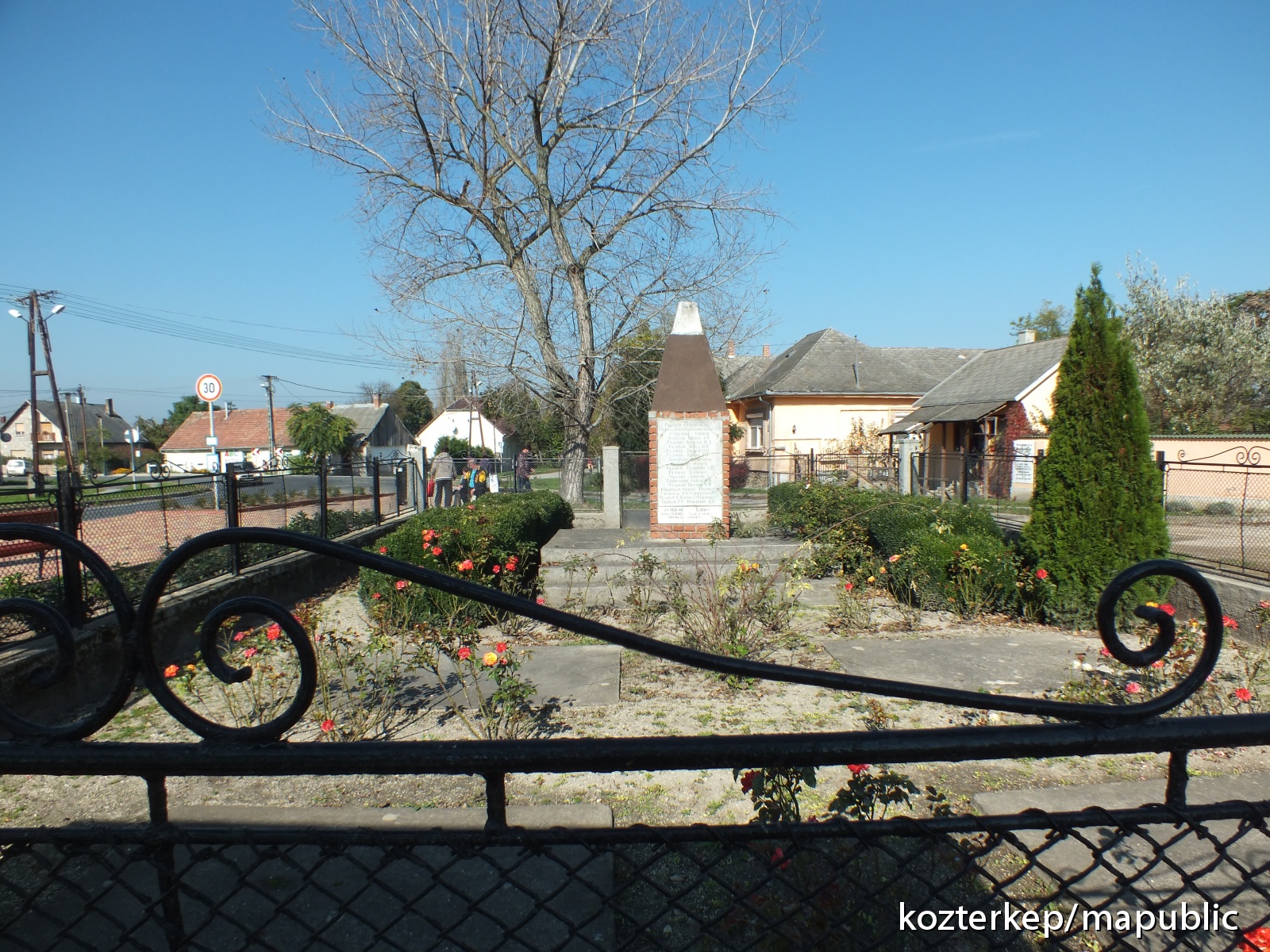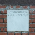 Egyik oldalán egy nehezen olvasható felirat, talán: Felszabadulásunk … évfordulójának emlékére a magyar nép szabadságáért életüket áldozó szovjet katonáknak. Ezt az oldalt nappal szemben rossz minőségben tudtam csak fényképezni. Másik két oldalán nevek, katonai rangokkal, mint kapitány, hadnagy, közlegény.