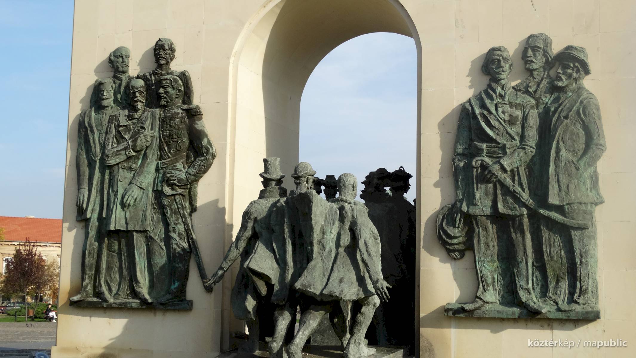 „2004-ben Adrian Năstase kormánya több országgyűlési képviselő tiltakozása ellenére jóváhagyta, hogy a [Szabadság-]szobrot ismét felállítsák a román--magyar megbékélésnek szentelendő emlékparkban. Az volt a feltétel, hogy a téren legyen egy 1848-at jelképező román köztéri emlékmű is. A téren egy 9 m magas győzelmi kaput állítottak föl, és a Szabadság-szobor már épülő talapzatát vele szembe kellett fordítani. A fordítás – nem minden szándék nélkül – végül kevesebb, mint 45 fokos lett, így Hungária alakja nem néz pontosan szembe a diadalívvel.
