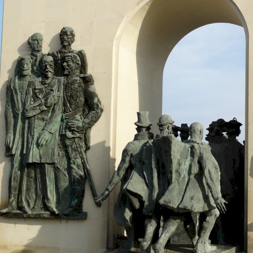 Az emlékművön a diadalív "alatt lépkednek a bukaresti forradalmárok, míg a diadalíven Havasalföld, Erdély és Moldva 1848-as mozgalmai vezetőinek a domborművei találhatóak, köztük Nicolae Bălcescu, Avram Iancu és M. Kogălniceanu. Ugyanitt szerepel Avram Iancu megbékélése Kossuth Lajossal is."