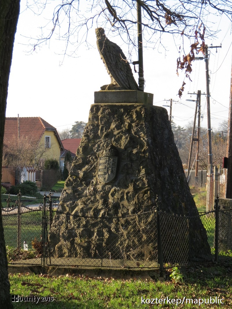 Az építményen látható továbbá: Bal kéz felől egy pajzson egy csapatkereszt, rohamsisak, kard és 1914, 1918 évszámok. Középen kard, puska, rohamsisak, tölgy és olajágak. Jobb kéz felől a magyar 'koronás kiscímer'.